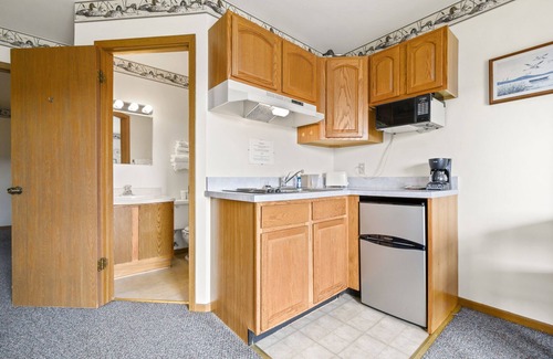 Our Studio Suites have a Private Bedroom with queen size bed, and a separate living room with queen sleeper sofa. There is also a spacious Full Bath, and a Kitchenette fully equipped with cookware and dishes, 2 burner stove top, mini refrigerator, coffee maker, toaster and eating area. Our Studio Suites accommodate up to five guests. Relax in the AC and enjoy Flat Screen Cable TV and Free WiFi after a fun-filled day on the Beach, or slip out to the refreshing Pool to cool off.