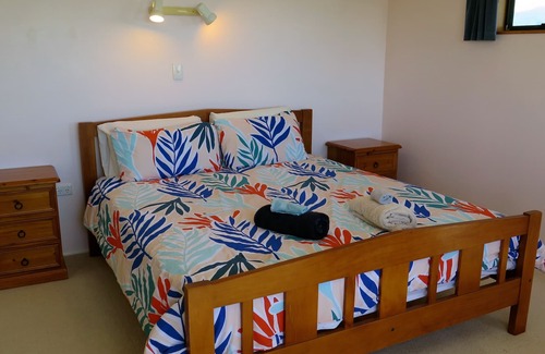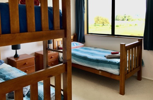 Downstairs: Semi-self-contained, with 2 bedrooms. Queen (sleeps 2), bunkroom (sleeps 2). Lounge - single bed (Sleeps 1). Jug, microwave and toaster in the combined living area, with a ranch slider providing separate entrance from upstairs. (Portable hob and electric frypan available on request). Shower and loo. Freeview TV. Heater for winter.
