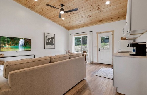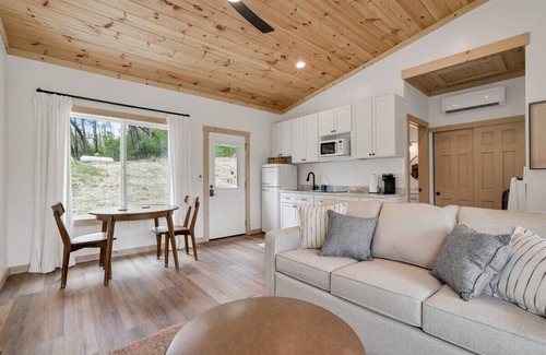 When you walk into the Onyx you will find a living space with a kitchen, dining table for two, and a couch and 50" TV. Through the large sliding door we have a covered porch with Adirondack chairs and a wood burning fire pit. The kitchen has a fridge, microwave, and two burner cook top. We also have a Keurig K cup coffee maker. In the bedroom you will find large windows, a queen bed, TV with DVD player and a closet. We have a stackable washer/dryer in the hall closet. In the full bath there is a walk in shower with glass sliding door. Outside there is a paved sidewalk leading to the covered hot tub area.