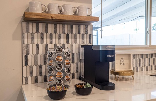 The kitchen is equipped with an oven, a refrigerator, a coffee maker, and a toaster. And you can even travel light because you'll have a washer/dryer.