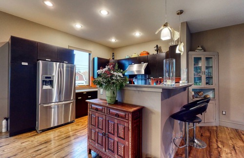 This gorgeous three-level house is close to the ocean with all the comforts of home to ensure a long and relaxing getaway for you and the people you love. The main-level living space is open and welcoming, with lots of natural light, burnished floors, and modern finishes throughout. The entertainment area features comfortable furniture looking out over the expansive back deck furnished with a private gas grill and plenty of outdoor seating. The full kitchen is equipped with all the stainless steel appliances, counter space, and cabinet storage you'll need to prepare delicious meals, and you can serve up to six dinner guests at the dining table while the little ones chatter away from the two breakfast bar stools. The main level also includes an office area complete with a desktop computer and two reading chairs. Downstairs, you'll find a quiet space furnished with a spacious sofa, a stove, and a flatscreen TV, the ideal setting for older kids and private time with a good novel. On warmer months, you'll love gathering everyone around the firepit for an evening of toasted 'Smores and good company. When it's time to call it a night, you'll have three well-appointed bedrooms to enjoy, one on each floor.