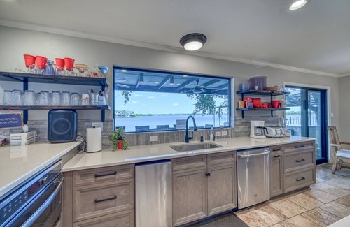Beautiful home, Stairs that go down into lake!! No need for a pool - it is the Best Water on Lake LBJ - perfect for relaxing in the water. Water toys include kayaks, paddle boards, lily pad! Huge party deck, covered dining area with outdoor kitchen. Brand New kitchen. Perfect for extended family vacations! In the fall, perfect for golf/football watching getaway!
