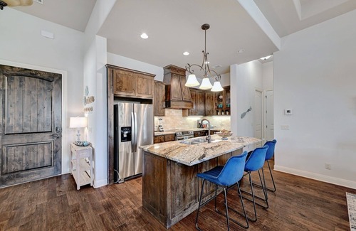 Come and stay at Eagles Rest Lake LBJ on the upper Colorado. Enjoy the beauty the lake has to offer with the large picture windows. Have fun in the water or by the pool. Hang outside on the patio or under the lakeside pavilion and firepit. The sunsets are unforgettable! This is an amazing 4 bedroom/3.5 bath home with additional sleeping for 4 in the built-in bunk beds. The open concept floor plan assures a great view of the lake from inside of the house. Home is furnished with comfort in mind, so you can unwind and leave your cares behind. There are plenty of indoor and outdoor activities for both kids and adults to relax and have fun. You can fish from the dock, jet ski, go boating and much more! The kitchen is fully stocked with dishes and cooking supplies. Amenities also include a washer and dryer in the home. There is a dining area with a table with seating for 8 and 3 bar stools at the island, 2 living area, heated and cooled garage, outside patio, lakeside pavilion and grill. Make the memories of a lifetime at Eagles Rest Lake LBJ!