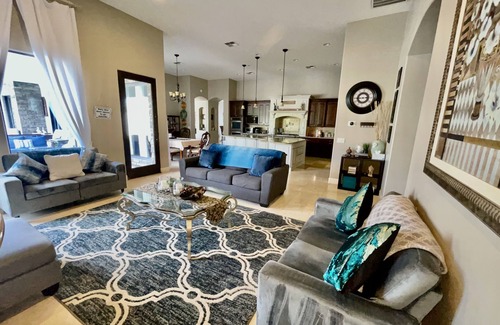 Immerse in nature to recharge yourself and to unwind after long days. This is a place to reconnect with families where guests can soak and cool off in the outdoor pool year-round & unwind in heated SPA for distinctive treatments. Tucked away on acre lot, it offers wealth of family-friendly amenities. When you are tired of games, entertaining kitchen/living room to eat, the private pool for cool off, SPA to unwind, Arcade for fun, ping pong for fun. Billiards, Shuffleboard & Foosball are available for your entertainment. In this villa, the games and diversions never end. You can challenge family members to any game. The main house is single level with 6-bedrooms & solstice Casita has 2 bedrooms. The 7 king & 2 queen beds in 8th bedrooms offers the perfect combination of privacy, comfort, and entertainment.