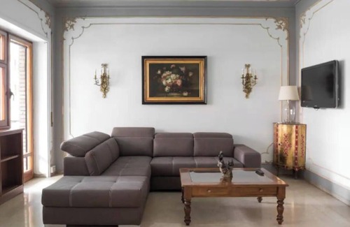 Two large, elegant living rooms are perfect for relaxing or gathering with family and friends. Both are furnished with luxurious, antique decor that harks back to the late 1800s, adding a refined, historical atmosphere to your stay. There are 5 tastefully decorated bedrooms, each offering a unique blend of comfort and charm. The marble floors and antique furniture create an ambiance that transports you back in time while providing modern comfort. The apartment features 3 spacious bathrooms, each equipped with a shower, bidet, and all necessary amenities. These bathrooms are designed with marble finishes, adding to the luxurious feel. A fully equipped kitchen provides everything you need to prepare meals at home. It features modern appliances and plenty of counter space to cook for large groups.