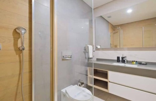 Bathrooms - This modern bathroom has a beautiful-looking mirror, shower, and sink. Constant hot water and high water pressure are available. The toilet seat has a bidet. A washing machine is also placed in the bathroom and can be used with just a touch of a button.