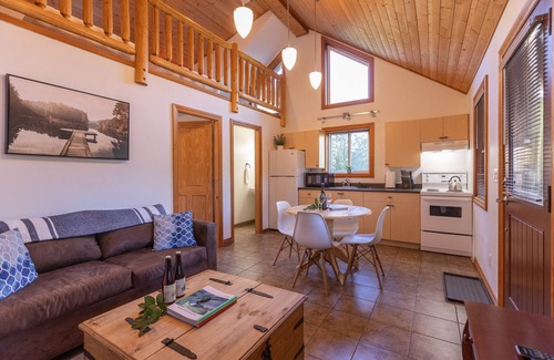 The cabin features one cozy bedroom with a queen bed, a loft with two single beds, and a pullout couch in the living room, comfortably accommodating up to 4 guests. The well-equipped kitchen includes all the essentials for preparing your meals, while the heated floors add warmth and comfort throughout the main living area. Step outside to the spacious, covered private deck, perfect for relaxing with a full-size gas BBQ for outdoor cooking.