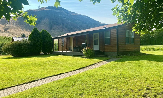 Experience first hand how your fruit is grown! This 1 bedroom, 1 bath house is located on the lower edge of a 35-acre apple orchard. We also grow peaches, nectarines and much more. The house has a private entrance with parking for 2 vehicles on a cement pad attached to the house. There is plenty of room to park a boat, or other RV. Full length deck has ramp on one end and steps on the other. The "sister cabin" next door can be used as a second bedroom for a party of four, or a stand-alone unit for those who don't need all the amenities of a complete house. Newly refurnished. No streaming TV, but Roku-accessible Netflix and more. Free Wi-Fi. Kitchen is equipped with dishwasher, garbage disposal, full-sized refrigerator and stove, microwave. Dishes and cooking utensils are provided. Bathroom has large walk-in shower. New washer and dryer. Bedroom has queen-sized bed with full-surround hygienic mattress cover and pillow covers. Large, tranquil yard has magnificent old maple trees and a waterfall/pond, providing a lovely place to picnic or enjoy a glass of wine in the evening. Located on the property is "Paws Produce and Fish Market", where fresh Alaska seafood and seasonal produce can be purchased, as well as many gourmet food items and locally hand-crafted gifts. Feel free to hike around the orchard or on the nearby Whistler Canyon Trail. Relax in a row boat on our small lake and enjoy the abundant waterfowl residing there. A quaint old cemetery borders the property, providing an excellent opportunity for headstone rubbings, for those interested in genealogy. Oroville and Tonasket are only 8 miles away, with many activities available.