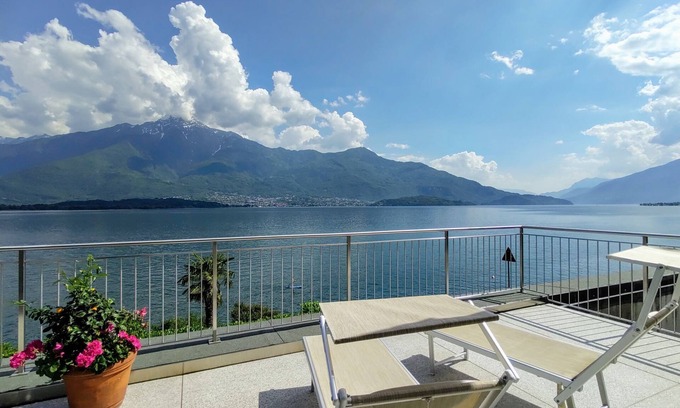 "Orchidea (GLA126)", 3-room apartment 70 m2 on 1st floor. Modern and tasteful furnishings: living/dining room with dining table and satellite TV. Exit to the terrace. 1 room with 1 french bed (160 cm). Exit to the terrace. 1 room with 2 beds. Exit to the terrace. Open kitchen (oven, dishwasher, 4 induction hot plates, toaster, kettle, microwave, freezer, electric coffee machine). Shower/WC. Gas heating, air-conditioning. Terrace. Terrace furniture, deck chairs (2). Marvellous view of the lake, the mountains and Monte Legnone (2609 m). Facilities: washing machine. Internet (WiFi, free). Parking at 30 m. Please note: non-smokers only. Maximum 1 pet/ dog allowed. No lift. IT013107C2UIU3UJNO