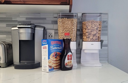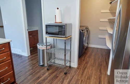 Gather your large group in this three-story house with four bedrooms, two and a half bathrooms, and three living areas. The fully equipped kitchen with custom countertops and cabinetry has everything you need including a dishwasher, microwave, oven, full-sized fridge, a selection of small appliances and basic cooking essentials. Begin your day with a warm cup of coffee or hot chocolate, made with our Keurig coffee maker. Travel lighter and use the laundry room with full-sized washer and dryer. Unwind in the private garden featuring a gas fire pit, grill, grassy area, and a stone staircase with views of Orem and Utah Lake. Watch your favorite shows or movies on one of the 55" 4K HDTVs located in the upstairs living room or basement game room using Chromecast or Air Play from your smartphone, or play a BluRay. On your first morning, wakeup to complementary pancake mix, syrup, cereal and milk to help you get started.