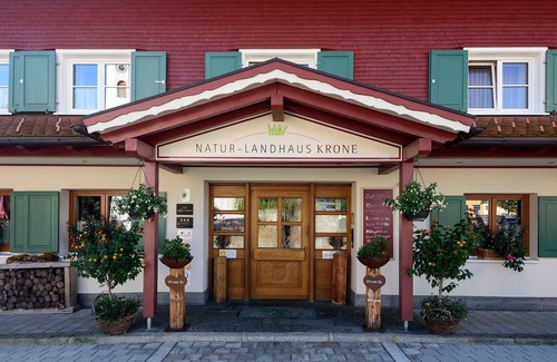 Our pleasure resort Maierhöfen is an Allgäu municipality in the Bavarian Lake Constance region, district of Lindau (Lake Constance). The "Natur-Landhaus Krone" is located in the Westallgäu between royal castles and Lake Constance, near Oberstaufen. In the middle of the small village Maierhöfen on the outskirts of the village. Open view of the Nagelfluhkette or the spa garden. Stylish holiday nature hotel with alpine wellness area, panorama lounge pool, wellness garden with sensory path and Kneipp mountain spring water course. Our biocomfort rooms are all equipped with wood, glass, stone, linen or leather, as well as with new bathrooms. Comfort with 38 "satellite TV with radio reception, laptop safe and mostly Bakonen. Guaranteed rest in healthy Allgäu when hiking, cycling, swimming in natural lakes or tennis for free at the house. In winter direct access to the tracks and the lift as well as snowshoe hikes to the own mountain hut. Guided hikes in the summer.