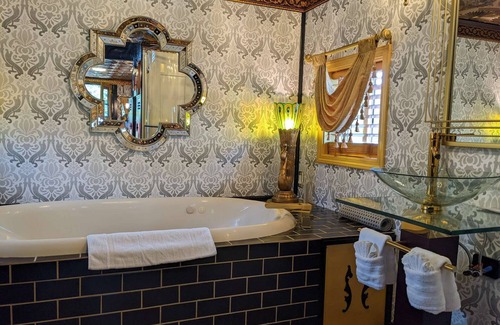 Welcome to the Orient Express, world's most renowned luxury train. Our 1920s Art Deco train car, sparkling in it's black and gold accents, will take your breath away. This utterly unique retreat invites you to enjoy a new kind of railroad adventure, one centered on classic comforts like terry cloth robes, vintage vinyl record tunes, relaxing sophisticated interior lighting. A private whirlpool tub will inspire breezy relaxation and unhurried enjoyment. The bedroom dazzles with golden ceilings and custom wood accents. The second floor cupola sleeping areas are an ideal lounge to curl up with a book and luxuriate in the rare pleasure of unplanned contemplation. A meticulously thought-out floor plan provides for all the amenities that are so compact and functional, it's irresistibly cute: a mini-kitchen with everything you need to prepare a home-cooked meal, a folding dining table/work desk and a sitting area/Murphy bed. Soothing comforts such as top of the line noiseless heating and cooling, plush pillow-top mattresses and high-speed internet make for a truly unforgettable night on the rails. Give the gift of time travel and awaken echoes of the bygone era. "Can't repeat the past? ...Why of course you can!" (F. Scott Fitzgerald, The Great Gatsby)