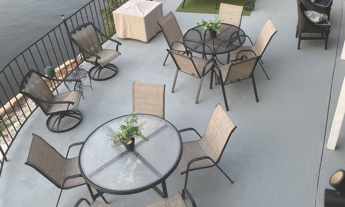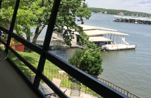 Fully remodeled Lakefront home in a lovely cove sleeps 12. Great new large concrete dock to enjoy with a partial boat slip, dive platform, and a wet step ladder for ease of exiting the lake. Enjoy a beautiful view of the main channel from the home or the dock. This lake home is in the heart of Osage Beach, and waterfront. We are a five-minute walk from Backwater Jacks. We are within minutes of plenty of shopping with many restaurants nearby. We are also just five minutes from the strip. Enjoy the beautiful lake view while swimming in the lake, relaxing on our new large dock, or relaxing on the large lower-level patio or upper screened-in porch. Two living spaces in this home with a fully equipped kitchen to include kitchen staples. The kitchen seats twelve. The steps to the lower level are a little steep, but very manageable. There are also steps on the outside of the home. There is a bar area in the lower level with a full-size refrigerator to make it easy to store drinks and food while enjoying the large outdoor space with many chairs and several tables for dining outdoors or relaxing. This lake home has a propane BBQ grill that you are welcome to use, but PLEASE clean it after you are finished. There is a propane firepit for relaxing and a wood-burning firepit for roasting hotdogs and making S'mores. Hot dog and marshmallow roasting sticks are provided. There are two upper-level bedrooms with a queen bed each and a lower-level bunk room with eight curtained beds for privacy. Our lakefront home and dock include many life jackets, two kayaks, a large floating mat, a dive platform, a paddleboat, a paddleboard, pool noodles, lake floats, and a new outdoor shower. We have cards, games, and two TVs for relaxing on rainy days. Many great memories will be made on your vacation here at this lakefront home. You will want to come back year after year. Fun and relaxation will be had by all.