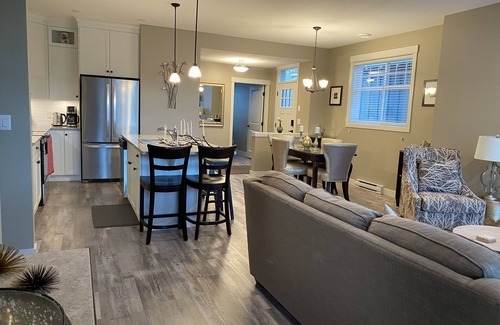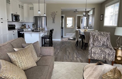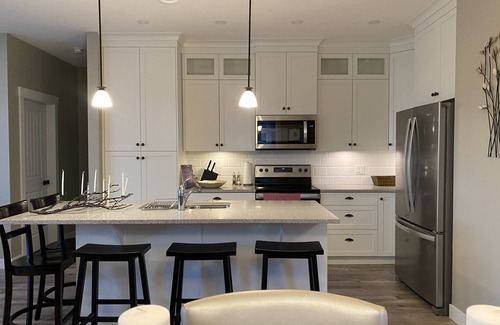Open concept main floor offers a large island Kitchen with seating, dining table and comfortable living room to hang out, relax, play games, watch movies (free with Netflix) and enjoy family meals. Space opens up to a screened-in covered patio with lounge furniture eating area and a BBQ to enjoy the fresh breeze during the warm summer afternoons and cool evenings.