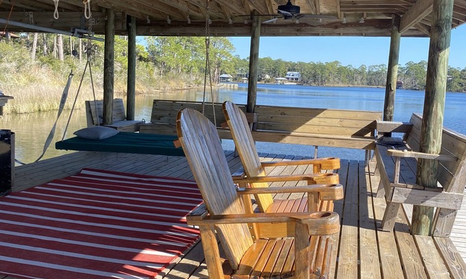 If you want to escape the crowds, condominium congestion, horrible traffic and delays, elevator waits,noise and lack of privacy, you will surely prefer and enjoy a memorable stay in our one bedroom, one bath beachfront cottage. Our modern waterfront guest cottage in the mouth of Soldiers Creek is a perfect couple's retreat with magnificent views of the mouth of Soldiers Creek and Perdido Bay. This wonderful getaway provides great swimming with a sandy bottom and a beautiful pier with safe dockage available for small or larger boats up to 30 feet in length. Weekly or monthly availability at a 10% discount. Our nightly rate is $130 per night. The rate drops to $120 per night October 1st-March 1st. Minimum stay is 4 nights. We have a $20 per night charge for boat moorage due upon arrival.