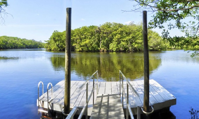 We have a brand-new aluminum dock with a swim ladder and underwater lights for night fishing. It is the perfect place to go fishing with your kids, or with your buddies! The public boat launch is nearby at Woodlake Recreation Area. You can launch your boat and bring it around to the dock, right in the backyard for the duration of your stay. The home is located on a bend in the Ochlockonee River with a small island across from us. And we have a large concrete pad for parking the boat trailer.