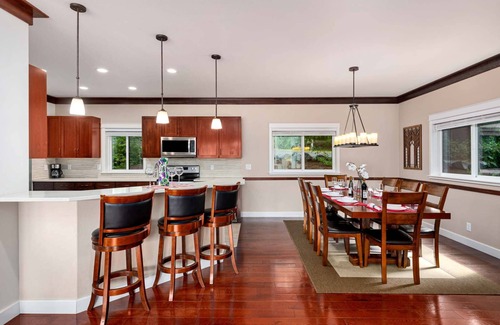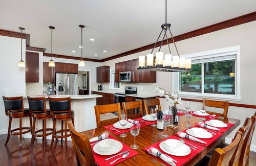The kitchen has everything you’ll need to prepare your meals, including a dual temperature wine fridge. The main living area features an open floor plan combining the living room, kitchen, and dining room, allowing for perfect casual family living and easy entertaining at the dining table and breakfast bar.