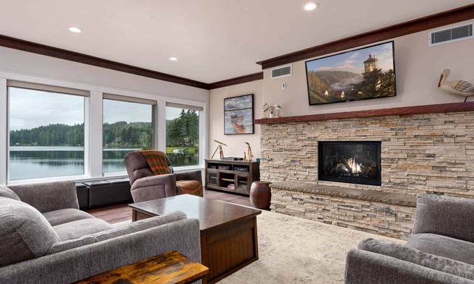 Otter Banks Lake House is lakefront living at its finest! Located along the eastern shores of Mercer Lake just 1.5 miles from Hwy 101, this fabulous 4 bedroom 2.5 bath 3100 sq. ft. home can sleep up to 10 guests. It is well appointed, sparing no expense and encompassing the beauty of Mercer Lake with unsurpassed views. Comfort, style, and luxury living come together in the many details around this striking home. Bring your boat or water craft and enjoy one of the finest lakes for fishing and play along the Florence Oregon Coast. Fish right off the dock for Largemouth Bass, Perch and Rainbow Trout.