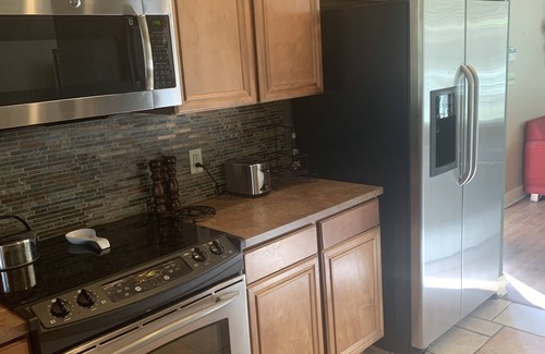 This is Our Furnished one bedroom first floor guest house. 1250 sq ft. + shared access to our second floor game room. No one else lives in or sleeps in Guest house. It is fully furnished including kitchen ware and linen for long term rental. King bed in bedroom. Sleeper sofa in living area. Includes off street outside on driveway parking for 2 cars. Access to dedicated washer and dryer for the Renter. On 1-1/4 acres lot next to our 1-1/4 acres lot that backs up to lake Lewsiville. This 2750 square foot house was custom built as a in-law , parents home .