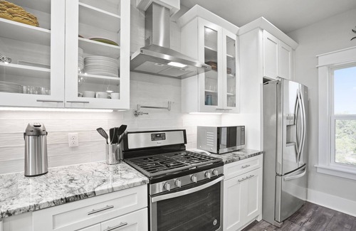- Kitchen includes stainless steel appliances and seats 4 at the bar.