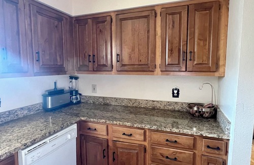 The fully equipped kitchen makes it easy to cook meals at home, along with a flat top grill in backyard.