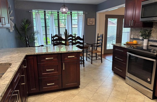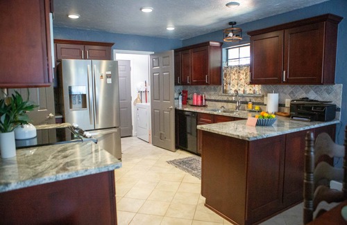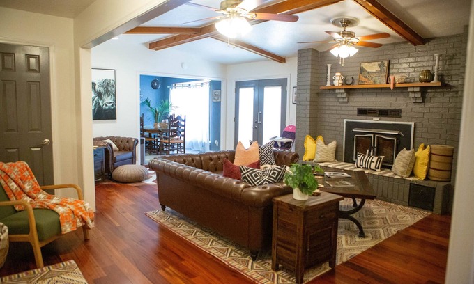 Kick off your boots and unwind in this cozy 3-bedroom, 2-bath getaway on the west side of Stillwater. Just minutes from OSU, Rosemary Ridge, The Range, Meditations, shopping, and local eats, it’s the ideal spot for weddings, game days, or getaways. Warm rustic décor, an electric fireplace, and a handy coffee bar set the tone inside.