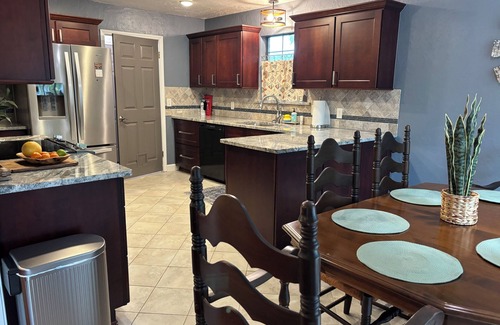 Outside, enjoy a spacious fenced backyard with a grill, cornhole, Jenga, Connect 4, and ladder ball toss—perfect for relaxing or entertaining.