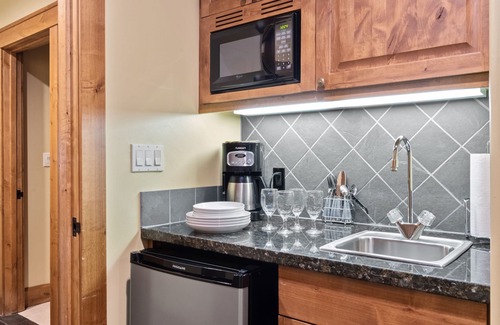 Comfort and functionality merge seamlessly at Grand View 491. This residence features a spacious primary bedroom adorned with a luxurious king-size bed, and the common area boasts a cleverly concealed Murphy bed, effortlessly transforming the space into either a cozy second bedroom for additional guests or a welcoming living room for relaxation and entertainment. This suite features a kitchenette with a mini fridge, microwave, and sink. This space features beautiful views of Snow King Mountain from the back deck.