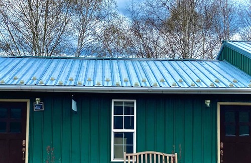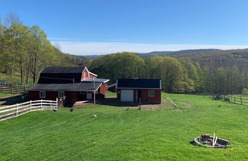 The Outpost was initially built by a prior owner to serve as a motorcycle testing facility (and was later repurposed as the Bovina Town Court before being renovated and converted into a studio apartment). As such, the front door of the Outpost opens onto a large paved area that historically served as a motorcycle training course (one windowlooks out over this area which is less picturesque than the other magical mountain views on the farm). However, the Outpost is separated from the farmhouse by rolling green pasture and rows of white birch trees and currant bushes which allows guests additional space and more privacy from other guests than the guest rooms in the shared farmhouse. The other two windows in the Outpost offer views of green pastures and birch tree rows. All windows have room darkening privacy curtains. Just outside the Outpost is a private fire pit where you can roast marshmallows and stargaze as well as several outdoor seating areas with gorgeous mountain-top views down the valley where you can see miles of lush green sloping land in spring and summer, a warm harvest of golds, reds and yellows in autumn, and billowing clouds and snowy peaks in winter. Please inquire with owner whether split wood for the fire pit is available for purchase on-site during your stay (we try to stock it but if we run out guests can purchase logs in Delhi).