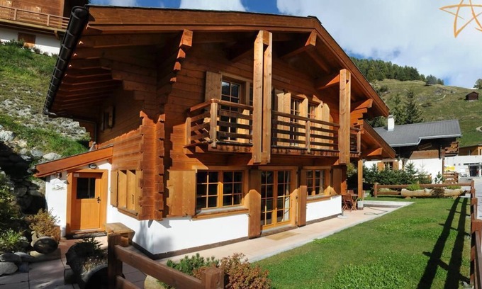Outside: chalet for 6 people, balcony, semi-covered terrace with furniture, garden, beautiful view, is located in Saint-Luc. Outside: chalet for 6 people, balcony, semi-covered terrace with furniture, garden, beautiful view, provides accommodation, featuring TV, Security/Safety, Barbecue/Outdoor Cooking, among other amenities. This Ski Chalet features TV, Security/Safety, Barbecue/Outdoor Cooking, to make your stay a comfortable one.