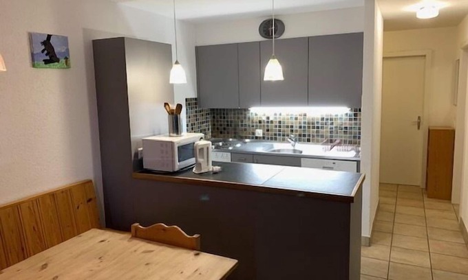 Outside : flat on the 1st floor of the apartment house with a large south terrace (85sqm), for 6 persons -Inside : approx. 55 sqm, living with fire place, dinette -Rooms : 1 room with 2 collocated beds, 1 room with 2 bunk beds (for 4 persons) -Sanitary : 1 bathroom with 1 bathtub and 1 separate WC -Kitchen : open kitchen with an electric cooker, oven, fridge, microwave -Various : No wifi, pets are not allowed, non-smoker, skiroom, common laundry, parking space nr. 61 in the municipal car parking, central heating -- -- -- Final Cleaning: A normal cleaning is included in the rental price. -- -- Available Kitchen Towels: Can be rented at the agency. -- -- Available Bath Towels: Can be rented at the agency. -- -- Bedsheets: -- Can be rented at the agency. -- -- Parking: A parking space in the communal car park -- -- Caution: A deposit of 500.00 is required. -- -- Cancellation Insurance: Included in the rental price for cancellation in case of major forces (medical attestation) -- -- Administrative Costs: None. -- -- Pets : According to description. -- -- Tourist Tax: Included in the rental price. --