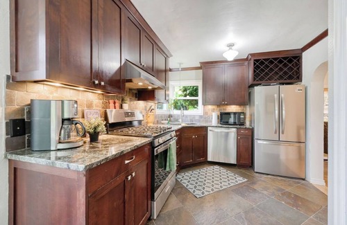 On prestigious College Hill, close to everything that makes Eugene a great college town.. One block to one of Eugene's largest parks in a great walking neighborhood, 3 blocks to the city's best pizza. Set up for that perfect college sports weekend including wifi and 70 inch ROKU TV. 2.3 miles to Autzen stadium, 1.7 miles to Hayward Field and Matt Knight Arena. On a large lot next to a church means very quiet. Can sleep up to eight adults, with an oversized downstairs bedroom with its own full bath. All new kitchen appliances, seating for 8 in the dining room and around the big screen.