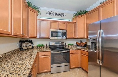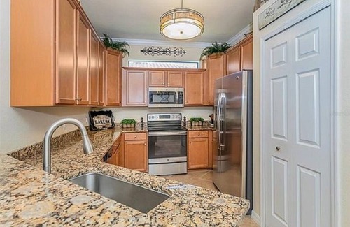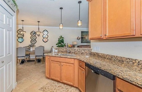 As you pull into the driveway you will notice the beautiful Mediterranean architecture and well-manicured landscaping all around. Through the front door, you are greeted by a lovely open hallway leading you to the main level living space. To the left, you will find the newly updated kitchen that has stunning granite countertops and all stainless-steel appliances. Adjacent to the kitchen, you will find the dining room which has a stunning table that can accommodate up to six comfortably. There are also two additional barstools. As you continue into the living room, you will find a large couch and two lovely chairs. Brand new 65 inch Samsung internet ready TV. Wireless internet with new router/ modem.