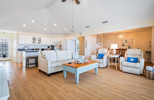 Perfect Peace - Welcome home to this beautiful canal front home on Mallard Street sleeping nine guests with just a short 5 min walk to the beach. Bring your boat to tie up in the protected canal. This gorgeous home has a split floor plan�a separate dining area that opens to the living room and the kitchen. Nice, tall ceilings in the living area make for a comfortable place for the family to gather. With the open floor plan, enjoy cooking a meal in a well-stocked kitchen and having dinner at the dining table for all the family to enjoy. This home sleeps nine guests while offering three bedrooms and two full baths. The master bedroom includes a king-sized bed and a flat screen television. The bathroom has a double vanity and a combination tub/shower. The second bedroom has a queen sized bed and also a flat screen television. The third bedroom offers a twin over a full bunk and a television as well. There is a queen sized sleeper sofa in the living area.