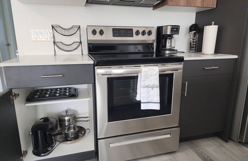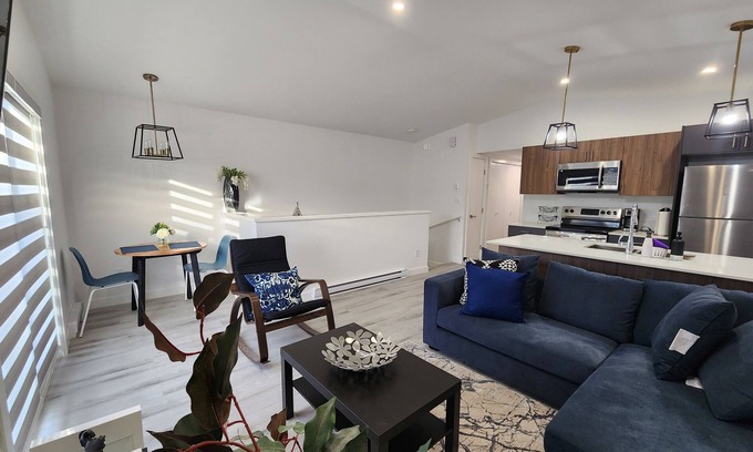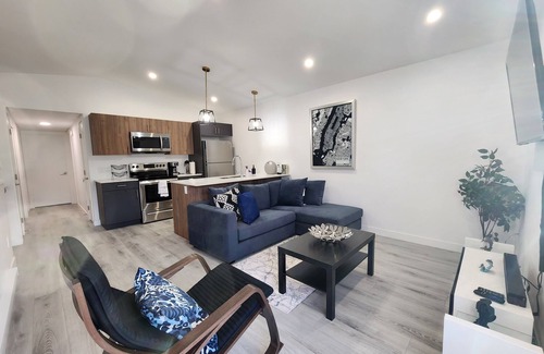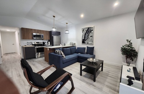This is a new built and con-temporarily furnished apartment suite. The apartment suite is located on the second floor of a duplex with its own separate entrance and space. The house has a cute deck where you can enjoy fresh air. Living room comes with an open spaced concept, air conditioner with two bedroom furnished with study table and chair. The living area includes a Smart TV with Ultra HD Netflix, and a high speed Wi-Fi. The kitchen has a brand new stove, fridge, coffee maker, toaster, pots and pans as well as other cooking utensils. The house comes with brand new washer and dryer in suite. You will check in with keyless entry. Free parking available in the back lane’s driveway.