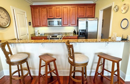 The living room is cozy and has a perfect view of the water as well as the kitchen, which is fully stocked, if you choose to stay in and cook. Popular amenities include a standard coffee maker, microwave, ice maker, dishwasher, and washer & dryer. Both bedrooms feature a king size bed and en-suite bathroom with tub/shower combo. The living room has extra sleeping space featuring a queen size pull-out sofa and a futon.