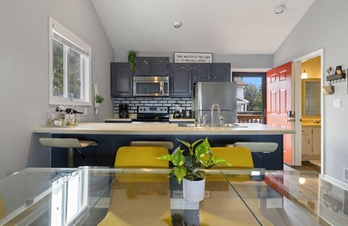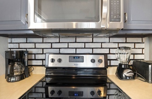 The open concept kitchen and dining area features stainless steel appliances, a large dining room table, a large breakfast bar with 4 barstools, and all the essentials you need to prepare meals.