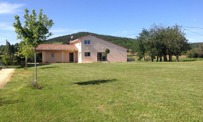 Large recent villa located in the countryside, while being close to all shops. Very bright, spacious, surrounded by shaded terraces overlooking the fields. Entirely built on basement or can park two vehicles. Ideally located in the heart of the Lot and close to the Dordogne Valley. Near many tourist sites:
