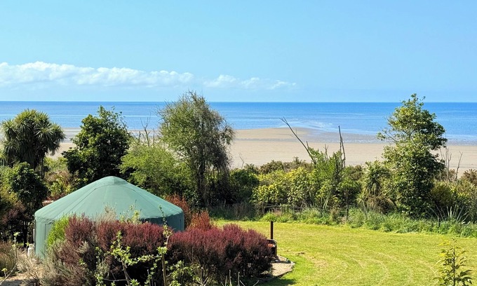 Our spacious yurt offers a serene escape just steps away from a quiet stretch of beach with golden sands and the gentle sound of ocean waves, nestled between Collingwood and Milnthorpe in Golden Bay.
