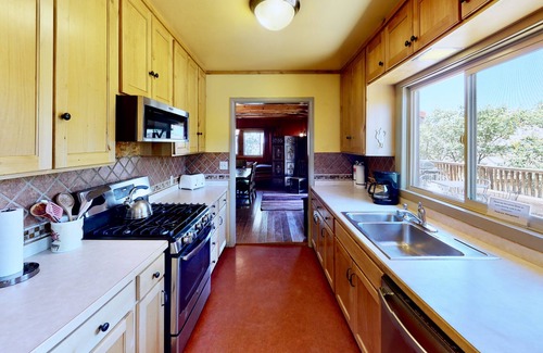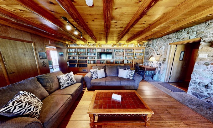 The Ranch House offers a spacious, ‘rustic luxury’ log cabin with a single level floor plan sleeping 2 to 12 people. With 3 bedrooms, 2-1/2 bathrooms, you’ll find it ideal for a family vacation, group retreat, or romantic get-away for two. The absence of telephone and TV ensures you’ll have uninterrupted time, even as you remain in touch via high-speed internet. The living area features a native cobblestone wall with integral fireplace, a library wall and a view of the apple orchard. A large dining area connects to the fully equipped kitchen including a washer/dryer, and a half bath is located off the kitchen. The charming master suite has a king bed and old-fashioned claw foot bathtub; two other bedrooms have two queen beds each and share a hall bath with full tub/shower. Two daybeds under the dining window provide additional sleeping/seating. The back patio has a gas grill for cookouts and beautiful views of the mountains. And you won't find a better location in Pack Creek; this prime cabin is the closest unit to the large community swimming pool (traditionally open Memorial day until Labor Day but subject to change), and shared hot tub and sauna.