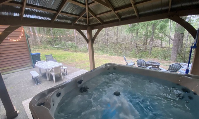 The Packwood Adventure Lodge is the perfect place to retreat to the mountains. Open layout offers cozy entertaining around the gas fireplace and open kitchen. Backyard is private with patio entertaining around the hot tub with covered gazebo to enjoy in all weather. River access for the community offers large picnic gazebo and walkable access. Just 12-15 minutes to White Pass, since being located on south side of river. Close to town and restaurants. Enjoy your time to unwind and relax in this perfect Mountain retreat. New Large game garage with ping pong, darts, Retro fridge, large game table, music, window to hot tub area.
