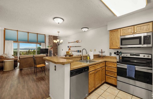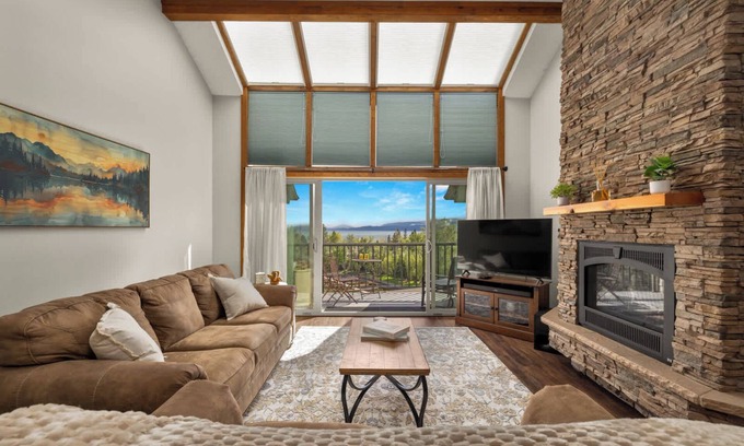 The open-concept living room centers around a cozy fireplace, with plenty of seating to enjoy lake views through large windows or step out onto the private balcony to take in the fresh mountain air.