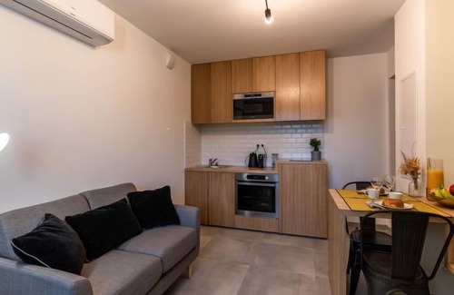 "Padova T2", 2-room apartment 35 m2. Comfortable and modern furnishings: living/dining room with dining table and TV (flat screen). 1 room with 1 french bed (140 cm, length 200 cm). Open kitchen (oven, 2 ceramic glass hob hotplates, toaster, kettle, microwave, electric coffee machine). Shower/WC. Heating, air-conditioning. View of the mountains and the countryside. Facilities: washing machine, hair dryer. Internet (WiFi). Please note: non-smokers only. Smoke alarm. Offer by a commercial proprietor according to Art. 155, IV, CGI