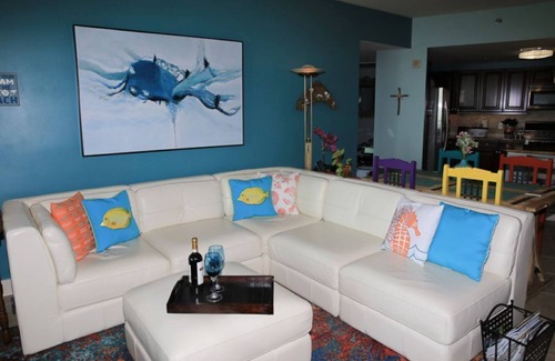 Our modern, beachy condo is located in a luxury high rise resort, the Palisade Palms, with direct beach access via private boardwalk and a stunning view of Galveston island from seventeen floors up. Inside, large windows throughout provide serene views of the sea; outside, the furnished private patio is an ideal space to watch the sunset with a cocktail.