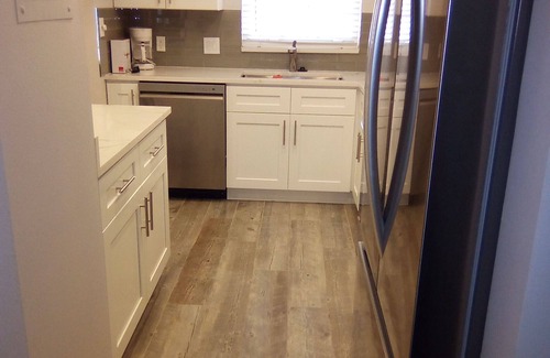 The fully equipped kitchen has been totally updated with new cabinets, new appliances which consists of a french door refrigerator with bottom freezer with ice maker, dishwasher, flat top stove with self cleaning oven, built in microwave, and disposal. Other features are a coffee maker, toaster, blender, juicer, etc. Our kitchen is fully stocked with everything you will need during your stay. We have also laid new tile in the kitchen floor.
