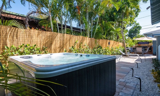 Escape to a tranquil backyard haven with a state-of-the-art hot tub surrounded by lush tropical plants. Some outdoor amenities, like the hot tub and bicycles, are shared with the main house, which may be occupied by one of the property owners. We’re here to make sure you have everything you want and need! Enjoy a peaceful retreat with outdoor furniture, a fire pit, dining area, BBQ grill, beach essentials, bikes, and sun loungers. Two friendly kittens have made themselves at home in the yard, adding a touch of charm to the outdoor space.