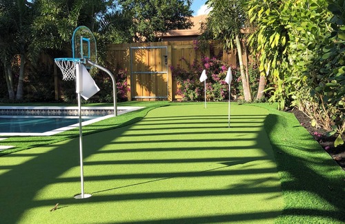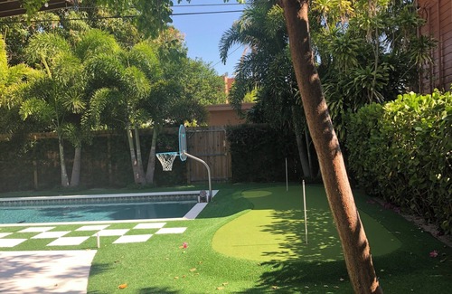 Heated saltwater pool, generously sized and equipped with a water basketball hoop, is for your year-round enjoyment. A putting green adjoins the pool for you or your children’s pleasure; we provide clubs and balls. An outdoor shower with spa nozzle under a bougainvillea-filled pergola contributes to the oasis experience. All this set against a backdrop of lush landscaping and complete privacy fencing. Expansive patio with gorgeous Cuban tile, dining table and chairs, conversational seating area with Lilly Pulitzer pillows, bar cart, oversized shade umbrella and sun loungers. A gas grill is available for you, complete with cooking tools. Fully enclosed front yard with wrought-iron fencing, luscious palms and flowering shrubs highlight this historically significant home. Circa 1923, it is one of the first homes in one of the first neighborhoods in West Palm Beach. The area is named after our mango tree in the backyard!