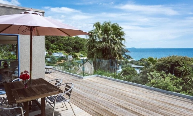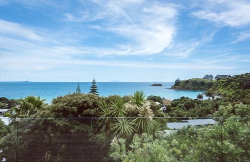 Little Barrier Island is visible on the horizon, the islands of the ‘Noises’ and ‘Tiri Tiri Matangi’ are to the left, Great Barrier Island to the right and in the foreground Palm Beach is invitingly close with the sound of the sea ever present.