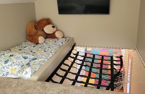 Depending on the time of year, you have access to lake swimming, fishing, waterslides, rope swing, paddle boards, and bicycles. Directly below is an area with a fire pit, bar, in-ground trampoline, refrigerator, and sink that can be booked for events such as birthday parties, receptions, etc. The space below is designed for up to 40 people. There is also a 2 miles walking trail that runs along the SmokyHill river.