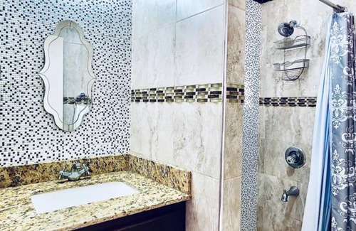 The bathroom featuring elegant fixtures and a shower combination where you can unwind with a refreshing shower.